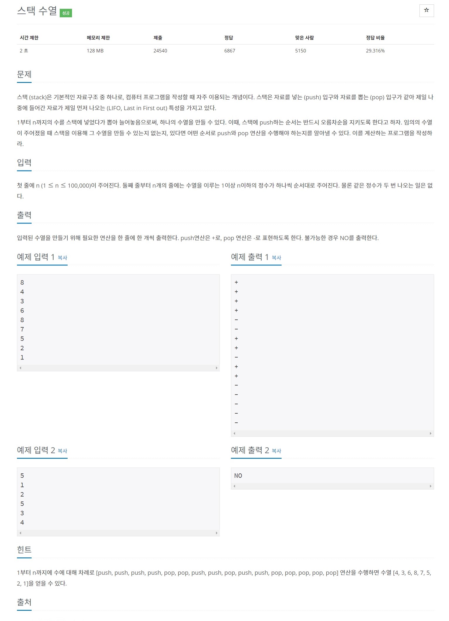 넣으려는 숫자가 스택에서 빼려는 숫자(입력)보다 크다면 NO를 출력하고 프로그램을 종료했다.