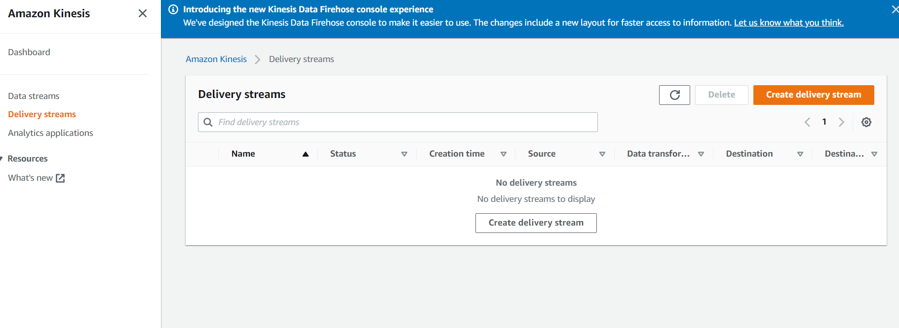 Delivery streams 항목 -> Create delivery stream